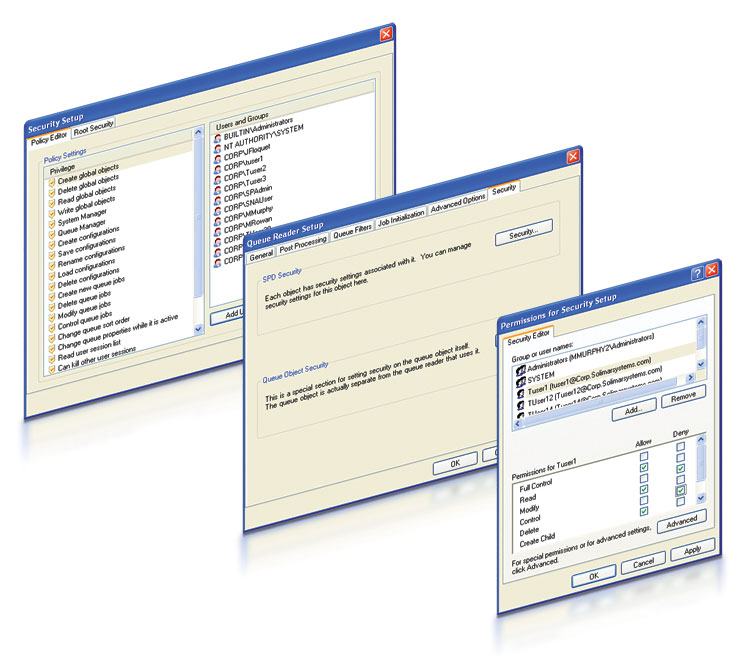 Granular security enables administrators to control who can do what in the system for every module in a configuration based on their login credentials. For instance, an administrator could prevent a group from accessing a job queue, prohibit a user from making configuration changes, and allow others to fully control some queues, but only monitor processing activity for others, and deny access to others.